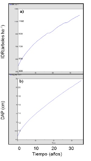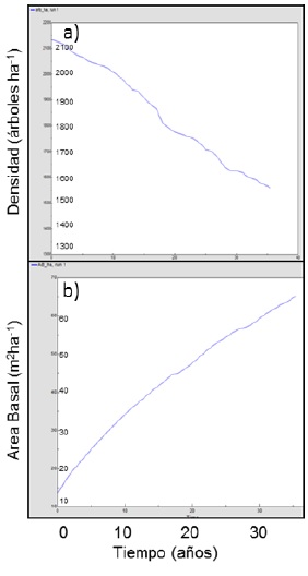 Por otro lado, la función de mortalidad ajustada en (11), considera la probabilidad de muerte de acuerdo al diámetro de los árboles y el IC, pero no considera el posible efecto del tiempo transcurrido, ya que a cada paso el modelo recalcula la probabilidad de mortalidad del árbol. Las Fig. 5 y 6 presentan las trayectorias de las variables de rodal: densidad, área basal, índice de densidad delrodal (IDR= densidad × (d/25)1,605 (Jerez y col., 2003) y diámetro promedio.