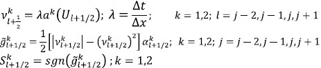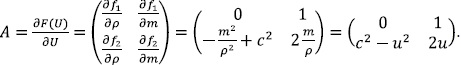 (32)Para los puntos intermedios, el modelo matemático no lineal homogéneo (24. a), será resuelto mediante el esquema de Harten explicito TVD de segundo orden de exactitud sobre cinco puntos. A continuación se presenta la matriz Jacobiana para las ecuaciones del gas dinámico en caso isotérmico y en una dimensión
