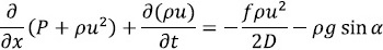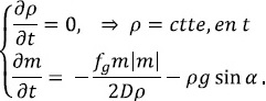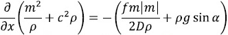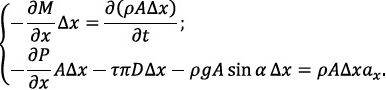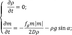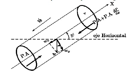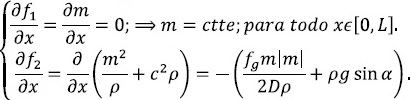 (1.a) (1.b)Donde es el caudal másico, la densidad del gas, el área transversal del gasoducto, el esfuerzo cortante, el diámetro del gasoducto, la aceleración de gravedad, es la inclinación del gasoducto, la aceleración del fluido y el intervalo espacial. La ecuación representa la ley de conservación de masas, y la ecuación es la aplicación de la sumatoria de fuerzas en el volumen de control representado por la figura ,(Villarreal2009). De la ecuación se puede obtener