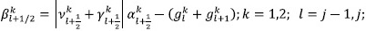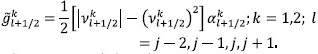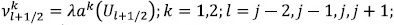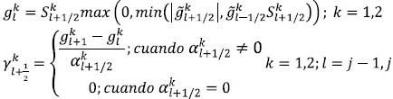 (36)Sustituyendo la ecuación (33), los auto valores y autovectores; además las ecuaciones (35) y (36) sobre el esquema TVD de Harten, para el sistema hiperbólico general homogéneo de leyes de conservación, se obtiene el esquema explicito TVD de segundo orden de exactitud sobre cinco puntos para el modelo hiperbólico sin fuente, dado por