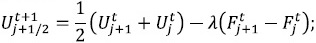 (47)Además y . Por últimose presenta el esquema de Godunov, explícito de primer orden de exactitud para el segundo y el penúltimo nodo, sobre tras puntos: