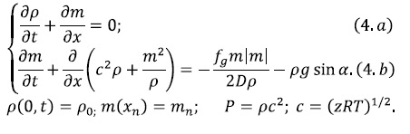 (4.a) (4.b)Donde es la densidad del gas, es el flujo de masa, es la presión, es la compresibilidad del gas, es la constante del gas transportado, es la temperatura del gas, es la distancia a lo largo del gasoducto, es el tiempo, es el factor de fricción, es el diámetro interno del gasoducto, es la aceleración de la gravedad, es la velocidad del sonido en el fluido y es el ángulo de inclinación del gasoducto. Observemos que en la ecuación, el valor absoluto fue agregado para considerar el sentido de la velocidad del fluido,( Villarreal 2009,. Martins y col., 2017, Benjamin y col., 1978, Wanga y col., 2018). El problema debe resolverse para el caso transitorio, utilizando los métodos numéricos expuestos anteriormente.