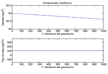 Primero presentamos los resultados gráficos obtenidos al resolver el sistema de ecuaciones en derivadas parciales hiperbólico no lineal, no homogéneo en caso estacionario; cabe destacar que estos resultados serán usados como condiciones iniciales del problema transitorio de transporte de gas en gasoductos inclinados.