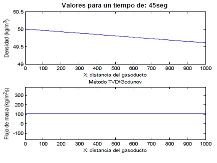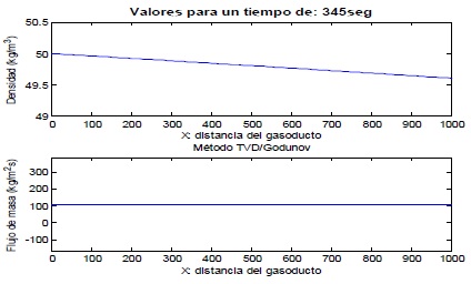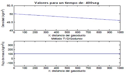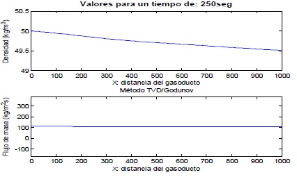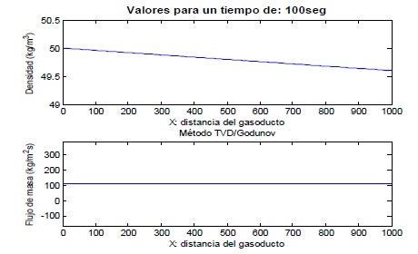 En las gráficas anteriores se observa como las variables conservativas de interés son calculadas; es decir, el método numérico se ha comportado aceptablemente bien, o en otras palabras, se sigue calculando las variables sin presentar oscilaciones en sus gráficas. Además, en la figura se observa como las ondas de propagación de masa de flujo se devuelven aguas arriba, dando así aumento de densidad a lo largo del gasoducto.