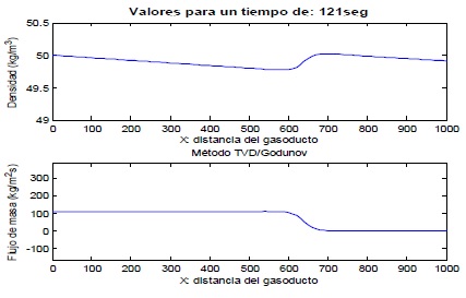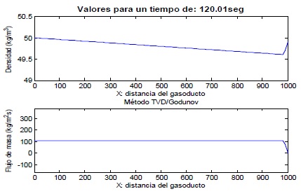 Ahora se puede observar como las variables conservativas de densidad y flujo de masa del gas ya han convergido a la solución, obteniendo resultados gráficos consistentes y estables. Por otro lado, consideremos la prueba mayor de estabilidad y consistencia de los métodos presentados en este trabajo, mediante la simulación de un cierre instantáneo de válvula al final del gasoducto; es decir, haciendo , para el tiempo 120<t180, segundos.
