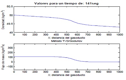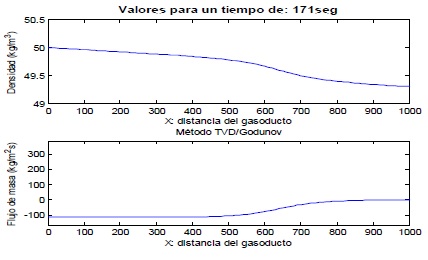 Como se puede observar en las gráficas anteriores, se ha obtenido el valor flujo de masa del gas al final del gasoducto igual a cero; es decir, se ha cerrado instantáneamente la válvula al final del gasoducto, teniendo como resultado el aumento de la densidad al final del gasoducto, por efectos del confinamiento de los volúmenes fijos de gas al final. A continuación se presenta los resultados obtenidos de densidad y flujo de masa del gas a lo largo del gasoducto para el tiempo t = 141 y t =171 segundos.