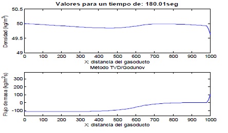 Cabe destacar que estas gráficas convergerán a rectas horizontales después de cierto tiempo, ya que cuando el flujo de masa sea cero en todo el gasoducto, entonces no habrá caída de densidad; es decir, la presión es una recta horizontal. Por otro lado, como otra prueba al método numérico presentado en este trabajo, haremos apertura instantánea de la válvula al final del gasoducto; es decir, impondremos nuevamente , a partir del tiempo t>180 segundos, obtenido los siguientes resultados gráficos para la densidad del gas y la mas de flujo a lo largo del gasoducto.