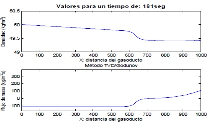 a se puede observar nuevamente, como el flujo de masa del gas vuelve a ser como la condición de frontera al inicio del problema transitorio del transporte de gas, dando como resultado la caída instantánea de la densidad al final del gasoducto; tal como se esperaba. A continuación se presentan los resultados gráficos de las variables conservativas en este trabajo para el tiempo t = 181 y t = 250 segundos.