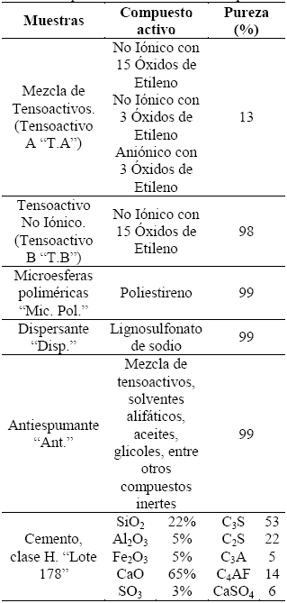 El tensoactivo A fue suministrado por Clariant S.A, el tensoactivo B por Oxiteno, el dispersante, antiespumante y el cemento por CPVEN y las microesferas poliméricas por PDVSA-Intevep.