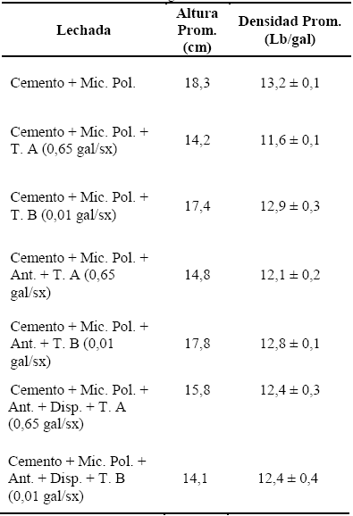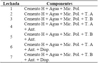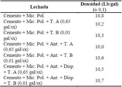 Para evaluar la dispersión de microesferas poliméricas en lechadas cementantes de baja densidad y proponer un mecanismo de interacción entre los aditivos y el cemento se procedió a formular las siguientes lechadas bases en donde la concentración de microesferas fue de 30%, la de antiespumante de 0,01 gal/sx y la de dispersante de 0,45% (ver Tabla 2).