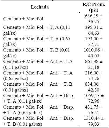 Por otra parte, las lechadas con antiespumante mostraron un incrementó de la resistencia a la compresión. Este comportamiento se debe a que el antiespumante impide la funcionalidad del tensoactivo de generar espuma, evitando así la formación de cavernas en la matriz las cuales debilitan la estructura.