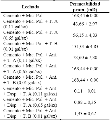 Para que una lechada pueda ser empleada en operaciones de campo esta debe poseer una permeabilidad al agua menor o igual a 0,1 mD (ISO 2003 ,API 1997). Los resultados mostrados en la Tabla 6 indican que ninguna de las lechadas estudiadas cumple con los requerimientos operacionales necesarios para su aplicación. Sin embargo, al aplicar los tensoactivos las lechadas presentaron problemas de adherencia entre la matriz cementante y las paredes del equipo donde se midió la permeabilidad, lo que favoreció el paso del agua a través de las paredes, evitando así una medición fiable de la propiedad.