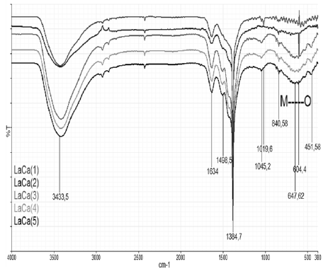 La figura 1 muestra los espectros infrarrojos de los óxidos mixtos tipo perovskitas de La0.7Ca0.3Ni1-xCoxO3 (x = 1.0 - 0.7 - 0.5 - 0.3 - 0.0), sintetizados por el método SCS, empleando glicina como combustible y por radiación microondas.