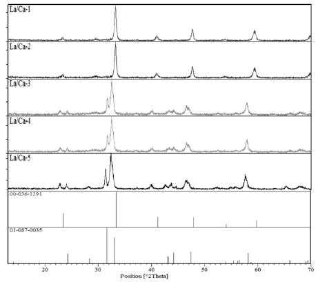 La figura 2 muestra los patrones de difracción de los óxidos tipo perovskitas de La0.7Ca0.3Ni1-xCoxO3 (x = 1.0- 0.7- 0.5- 0.3- 0.0). La identificación de la(s) fase(s) presente(s) se hizo por comparación con la base datos PDF2-2004 de la ICDD a través del software X'Pert Highscore Plus 2.1.
