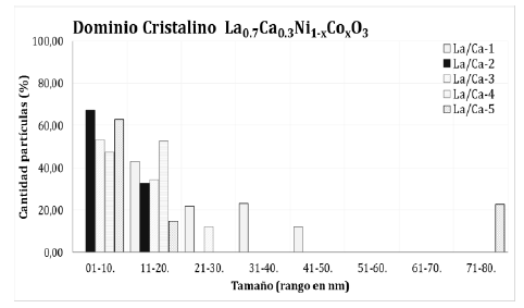 La perovskita en ausencia de Co, presenta el mayor tamaño cristalino, posiblemente debido a que la sustitución de Ni por Co en la estructura le confiere a estos sólidos mayor estabilidad térmica, evitando la sinterización de las partículas, lo que conllevaría a la formación de cristales más grandes.