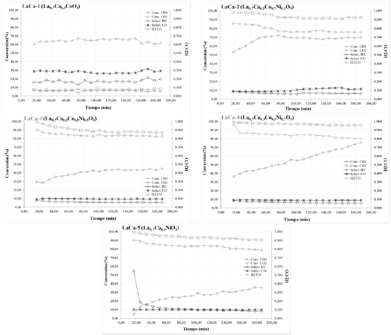 En la reacción RSM, la sustitución parcial de Ni por Co en la estructura de los catalizadores, les confiere a estos sólidos mayor estabilidad térmica, evitando la sinterización en condiciones de reacción. La perovskita más eficiente en cuanto a conversión promedio de metano fue LaCa-2 con 67,52%. La conversión de CO2 es favorecida respecto de la de metano en todos los catalizadores, debido a la presencia de reacciones colaterales como la reacción inversa de desplazamiento de vapor de agua. Además, todas las relaciones molares (H2/CO) muestran valores por debajo de la unidad, indicando que ocurre simultáneamente con la RSM, la reacción inversa de desplazamiento de agua, que provoca un aumento en la cantidad de CO y por consiguiente una disminución de la relación H2/CO final del gas de síntesis.