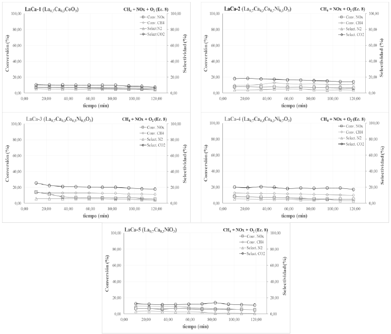 El catalizador con mayor conversión de NOx y CH4 fue el LaCa-3 con un 7,93% y un 12,43% respectivamente. Se observa un pequeño aumento en estas conversiones con la presencia de ambos metales de transición (níquel y cobalto) en comparación los las perovskitas monometálicas.