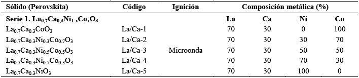La preparación de los óxidos tipo perovskitas se realizó a partir del método de combustión en solución, SCS, descrito por Patil y Aruna (Patil y col., 1997, Patil y col., 2002), y por Mukasyan y Varma (Mukasyan y col., 2001, Varma y col., 2003, Mukasyan y col., 2007); este método fue revisado por González-Cortes e Imbert (González-Cortes y col., 2013), y recientemente aplicado por Pérez (Pérez y col., 2015).