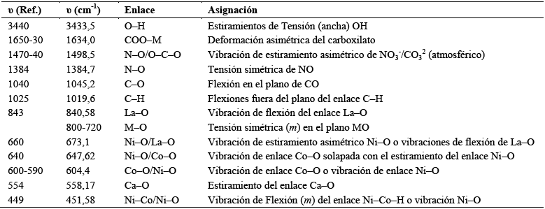 Entre los 800 y 720cm-1 se observan varias bandas que corresponden a tensiones simétricas (m) en el plano M-O, debido a las interacciones de los enlaces entre distintos elementos y el oxígeno. A unos 673,1cm-1 se debe a estiramientos del enlace Ni-O (Liu y col., 2013) o a vibraciones de flexión de La-O (Hussain y col., 2015). La señal en 647,62cm-1 corresponde a vibraciones de estiramiento del enlace Co-O (Radev y col., 2008) o interacciones del enlace Ni-O (Liu y col., 2013). Un pico ancho y de moderada intensidad en 604,4cm-1 se debe a vibraciones de estiramiento del enlace Co-O (Radev y col., 2008) que puede solaparse con la vibración de enlace Ni-O (Montes de Oca y col., 2010). La señal en 558,17cm-1 es debido al estiramiento del enlace Ca-O (Feyzi y col., 2015), característico de esta serie de catalizadores donde se encuentra presente el calcio. La señal en 451,58cm-1 es producto de vibraciones del enlace Ni-Co (Gao y col., 2012). En la tabla 2 se muestra la asignación de bandas de los espectros infrarrojos obtenidos.