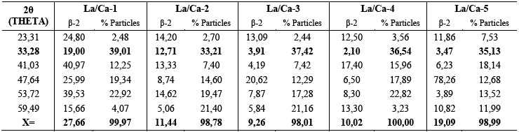 Ahora es posible relacionar el ancho y la intensidad del pico, con el tamaño de los dominios cristalinos; el ancho del pico integrado (FWHM) de la señal es inversamente proporcional al tamaño del dominio del cristal (β). Para realizar este cálculo se seleccionaron los picos de mayor intensidad de la fase dominante presente en los óxidos obtenidos (ver figura 3 y tabla 3).
