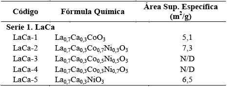 Los distintos óxidos tipo perovskitas sintetizados del tipo La0.7Ca0.3Ni1-xCoxO3 (x = 1.0 - 0.7 - 0.5 - 0.3 - 0.0) con glicina como combustible, se describen en la tabla 1.