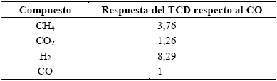 El factor de respuesta del detector de conductividad térmica, TCD, se determinó usando argón (Ar) como gas de arrastre, en un flujo de 30mL/min, a través del sistema de columnas en el cromatógrafo de gases (CGases).