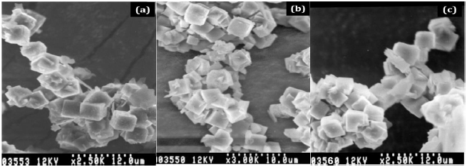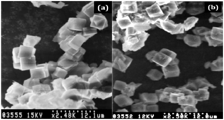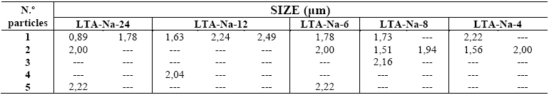 El análisis MEB, confirmó la geometría cúbica de los cristales de la zeolita LTA, característica de este tipo de estructura, así como también el tamaño aproximado de las partículas (tamaño de 0,89 a 2,49 micras para los cristales obtenidos de la zeolita LTA sódica). Además, se observó la presencia de material irregular, pero en poca cantidad en comparación con el material zeolítico de interés.