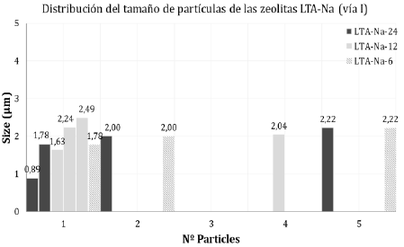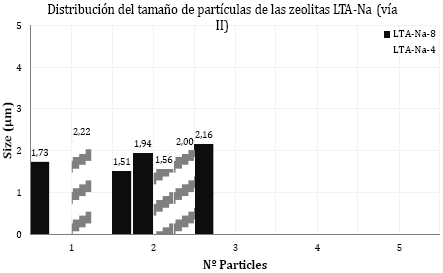 También es posible notar que además del material zeolítico deseado (zeolita LTA), existe la presencia de cristales considerados irregulares, material irregular, pero en pequeñas cantidades en comparación con la zeolita de interés. Además, la ausencia de partículas empaquetadas características del metacaolín, sugiere la conversión del mismo a través de ambas vías de síntesis (Corona y col. 2009). La tabla 7 muestra la distribución del tamaño de las partículas para las zeolitas de naturaleza sódica obtenidas por ambas vías de síntesis (vía I y II). La distribución del tamaño de partículas realizada para las zeolitas sódicas obtenidas por la vía I muestra que la mayoría de los cristales presentaron un tamaño mayor a 2 micras (figura 10), mientras que para las zeolitas obtenidas por la vía II mostraron un tamaño de partículas variable que van de 1,51 hasta las 2,22 micras (ver figura 11).