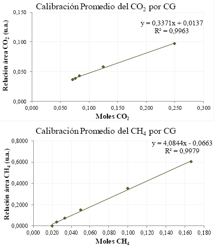 Las curvas de calibración mostradas en la figura 12, donde es posible observar que manteniendo el flujo de nitrógeno constante durante el experimento y a medida que aumenta la concentración de CO2 y/o CH4 el área bajo la curva se incrementa de forma lineal, obteniéndose una pendiente de 0,337 y 4,084 u.a./mol respectivamente. Con estos datos es posible calcular la concentración de CO2 y/o CH4 adsorbido durante las pruebas de adsorción a 60°C.