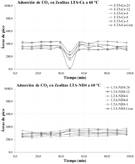 En todas las pruebas de adsorción se emplearon ~100mg de la zeolita LTA. La temperatura de análisis fue 60ºC. La relación molar del adsorbato respecto del gas de arrastre fue 0,03 (CH4/N2 o CO2/N2), con un flujo volumétrico total del 103mL (100mL del N2 y 3mL adsorbato).