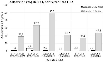 La mayor adsorción de CO2 presentada para las zeolitas LTA sintetizadas por la vía I (80ºC) es la LTA-Ca-12 y para la vía II (100ºC) es la LTA-Ca-4 con un porcentaje de adsorción del 97,2 y 47,6% respectivamente, sobrepasando el 38% de capacidad adsortiva de la zeolita comercial LTA-Ca-COM. Esto indica que la zeolita LTA-Ca-12 adsorbe alrededor de 5,456mg de CO2 por cada 5,613mg inyectados de dicho gas en los 103mL totales que circulan por la corriente del sistema. Esto permite determinar que la capacidad adsortiva para dicho sólido sea de 54,558mg de CO2 por cada 100mg de la zeolita empleada.