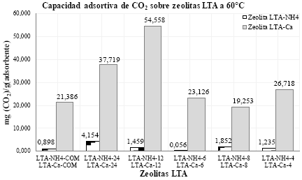 En la figura 14, se muestra la adsorción porcentual de CO2, de las zeolitas intercambiadas con iones Ca2+ a 60°C. Se puede observar que las zeolitas LTA modificadas con iones calcio, presentan una buena a regular capacidad de adsorción a la temperatura de 60°C, en comparación con los mismos sólidos con intercambio amoniacal, favoreciéndose la fisisorción, la cual es gobernada por fuerzas débiles (fuerzas de Van Der Waals) que no requieren una alta energía de activación para que ocurra la adsorción o interacción entre el CO2 y la superficie de la zeolita (Droguett 1983).