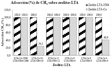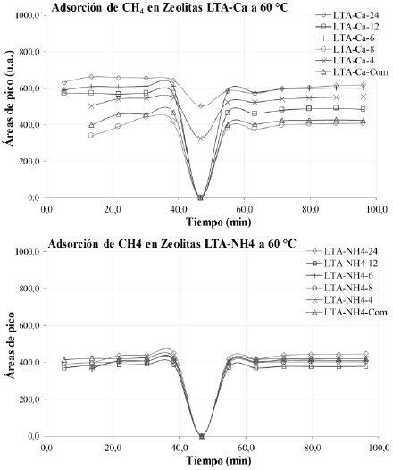 Para la adsorción de metano, sólo las zeolitas cálcicas sintetizadas a 80ºC (tc= 24 horas) y a 100ºC (tc= 4 horas), LTA-Ca-24 y LTA-Ca-4, adsorben metano en menor proporción (<50%), en comparación con el resto de las zeolitas cálcicas y sus homólogas de amonio a 60°C, donde todas adsorben el 100% del metano que pasa por el reactor.