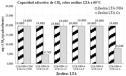 Respecto de la adsorción de CH4, las zeolitas LTA con modificaciones tanto cálcicas como amoniacales que presentaron 100% de adsorción, poseen una capacidad adsortiva de 1,968mg de CH4 por cada 1,968mg inyectados de dicho gas en los 103mL totales que circulan por la corriente del sistema. Esto permite determinar que la capacidad adsortiva para dicho sólido sea de 19,680mg de CH4 por cada 100mg de la zeolita LTA empleada.