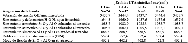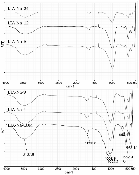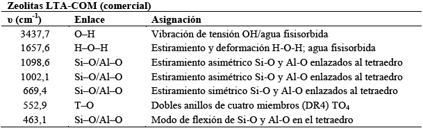 Mediante la espectroscopia infrarroja (FTIR) se identificaron las bandas características de dichos sólidos, por comparación con el espectro infrarrojo de la zeolita LTA comercial (LTA-Na-COM).