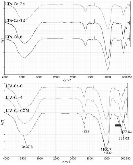 La figura 1 muestra los espectros infrarrojos de las zeolitas LTA-Na comercial y las sintetizadas empleando el método hidrotermal, con diferentes temperaturas y tiempos de cristalización, es decir, a 80ºC (tc= 6, 12 y 24h) y a 100ºC (tc= 8 y 4h). En todos los espectros se puede observar las señales características de este tipo de estructura (tablas 2 y 3). La banda ancha localizada en 3437,7cm-1 se debe a la vibración de tensión (estiramiento) de los grupos hidroxilos pertenecientes al agua físicamente adsorbida que se encuentra en las cavidades de la estructura (Alkan y col., 2005). Las vibraciones de tensión (estiramiento) y de deformación de los H-O-H correspondientes al agua molecular adsorbida se relacionan a la señal ubicada en 1657,6cm-1 (Briceño 2015). Las bandas fuertes que se observan a los 1098,6 y 1002,1cm-1 son asignadas a las vibraciones de estiramiento asimétrico de los Si-O y Al-O enlazados al tetraedro (Frostm y col., 2002), mientras que la banda que aparece en 669,4cm-1 se debe al estiramiento simétrico de los grupos anteriormente mencionados (Frostm y col., 2002).