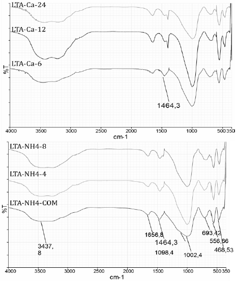 Los intercambios iónicos con CaCl2 realizados a las zeolitas LTA sólo muestran en los espectros IR un ensanchamiento en la mayoría de sus bandas, mientras que el intercambio con iones NH4+ muestran la presencia de una banda ubicada en 1464 cm-1 que se le atribuye a las vibraciones internas de la molécula de NH4+.