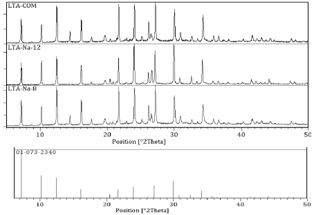La figura 4muestra los patrones de difracción de las zeolitas LTA-Na comercial y las sintetizadas empleando el método hidrotermal, a 80ºC (tc= 12 horas) y a 100ºC (tc= 8 horas). Se observa la presencia de una única fase característica de la zeolita LTA, cuyos patrones coinciden casi en su totalidad con el que se encuentra reportado en la base de datos PDF-2 de la International Center for Diffraction Data (ICDD) cuyo código es 01-073-2340 y que fue identificado utilizando el software X'Pert Highscore Plus 2.1. De esta manera se confirma que las bandas de cristalización obtenidas por espectroscopia de infrarrojo, son indicativo de la cristalinidad de los sólidos sintetizados.