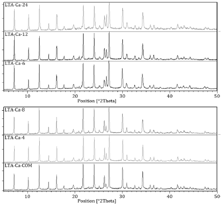 La figura 5 muestra los patrones de difracción de las zeolitas LTA comercial cálcica y las sintetizadas empleando el método hidrotermal, a 80ºC (tc= 6, 12 y 24h) y a 100ºC (tc= 8 y 4h) con sus respectivos intercambios iónicos cálcicos. En estos difractogramas es posible observar la gran similitud que existe entre los máximos de difracción obtenidos por ambas vías de síntesis de las zeolitas LTA cálcicas con los máximos de difracción correspondiente a la zeolita LTA-Ca-COM. En todos los casos se presentaron picos bien definidos lo que infiere una buena cristalinidad de los sólidos sintetizados.