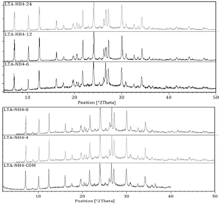 La figura 6 muestra los patrones de difracción de las zeolitas LTA comercial amoniacal y las sintetizadas empleando el método hidrotermal, a 80ºC (tc= 6, 12 y 24h) y a 100ºC (tc= 8 y 4h) con sus respectivos intercambios iónicos amoniacales. En este caso, es posible observar la presencia de una sola fase correspondiente a la zeolita LTA y picos bien definidos indicativo de una buena cristalinidad. Además, la gran similitud de los difractogramas obtenidos de las zeolitas sintetizadas por ambas vías con respecto al obtenido para la zeolita LTA comercial amoniacal, corrobora la efectividad de las vías de síntesis para la obtención de dichas estructuras.