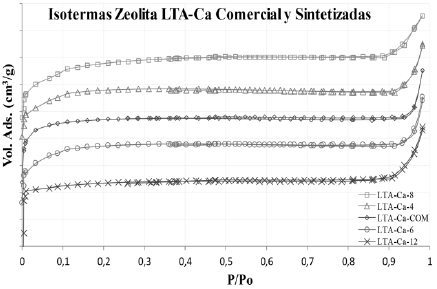 La figura 7 muestra las isotermas de adsorción de las zeolitas LTA-Na comercial y las sintetizadas empleando el método hidrotermal, a 80ºC (tc= 6 y 12 horas) y a 100ºC (tc= 4 y 8 horas).
