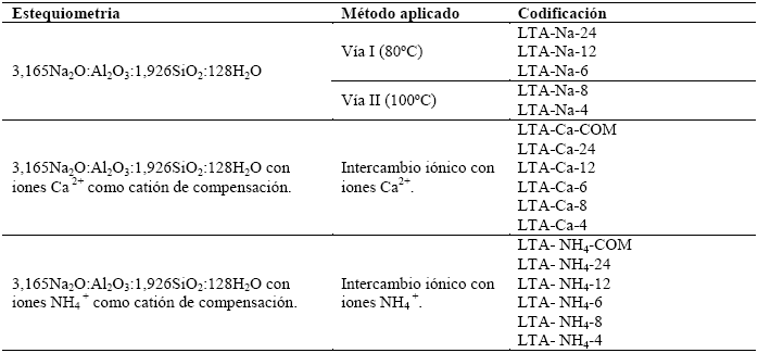 Las zeolitas LTA obtenidas a partir de la síntesis hidrotermal descrita por R.W Thompson (Robson H., 2001), se describen en la tabla 1.