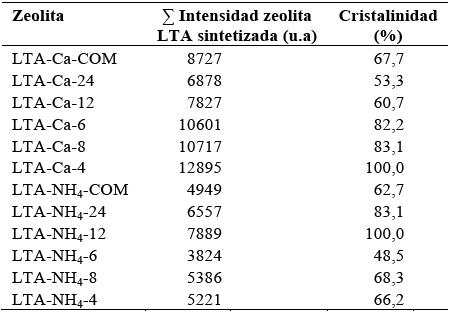 Las zeolitas LTA que presentaron mayor porcentaje de cristalinidad para la vía I de síntesis fueron LTA-Ca-6 y LTA-NH4-12 y para la vía II fueron LTA-Ca-4 y LTA-NH4-8 sobrepasando los valores de cristalinidad de sus homólogas comerciales.