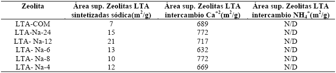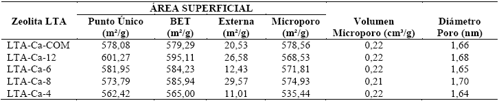 En la tabla 5, se aprecian los parámetros texturales que se ha podido estimar a partir de las isotermas de adsorción de nitrógeno a 77 K, observándose que la obtención de las zeolitas LTA por ambas vías y después de ser modificadas (intercambio cálcico) presenta propiedades comparables o similares a la zeolita LTA comercial modifica. En dicha tabla también se muestran los valores de las áreas superficiales tanto por el método del punto único como por el método de BET de las zeolitas obtenidas.