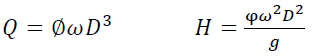 Donde D es el diámetro del rotor, N el régimen de revoluciones por minuto, H la altura de la bomba y Q el caudal, Di son los diferentes diámetros de rotor de un modelo e igual carcasa. Datos tomados en el sistema inglés según los gráficos del catálogo y convertidos al sistema internacional: Unidades en metros, radianes y segundos.