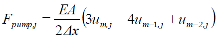 para determinar los desplazamientos en el mismo lugar para los siguientes pasos de tiempo. Para la investigación, se ha seleccionado desarrollar una solución numérica con un modelo de análisis de diagnóstico, la cual facilita la implementación numérica en la programación e instalación de las mismas en el conjunto de equipos seleccionados para el diseño del sistema de control. La ecuación 16 para calcular los desplazamientos en diferentes nodos de la sarta de cabillas.