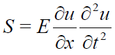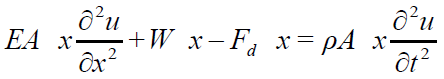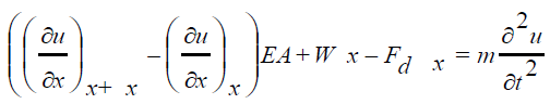 (6)El termino multiplicador EA, del lado izquierdo de la ecuación anterior, puede ser expresado como la segunda derivada del desplazamiento (u) con respecto a la distancia (x). Introduciendo esto, y expresando la masa como función de la densidad, área, llegamos a la siguiente ecuación: