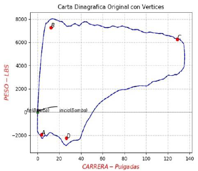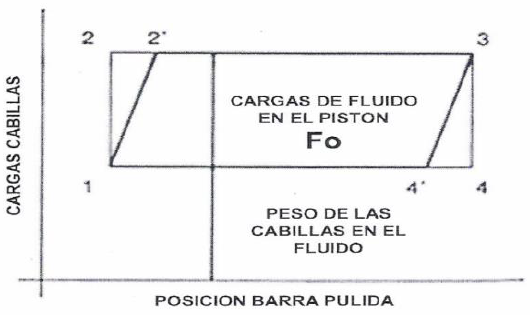 Una carta dinagráfica o dinamométrica de superficie representa el diagrama de las cargas medidas o predichas de la barra pulida en varias posiciones a través de un ciclo completo; la carga se exhibe generalmente en libras de fuerza y la posición se exhibe generalmente en pulgadas. Las cartas de superficie son valiosas para diagnosticar cargas en la barra, estructurales, y de torque en la caja de engranaje y motor. Para entender las características básicas de la carta dinagráfica, se partirá de condiciones simplificadas, asumiendo una barra rígida, una velocidad de bombeo lo suficientemente baja como para eliminar las fuerzas dinámicas, líquido incompresible bombeado y se ignoraran todas las pérdidas de energía a través de la sarta. Para este caso, la carta dinagráfica es la variación de las cargas en la barra pulida vs posición, que se ve representada para este caso ideal por el rectángulo 1-2-3-4 mostrado en la Fig. 2. En el punto 1 comienza la carrera ascendente y la válvula viajera cierra inmediatamente. Las cargas en la barra pulida, iguales al peso de la sarta de cabillas en flotación en el punto 1, rápidamente se incrementan las cargas indicadas por el punto 2, en la medida en que las cargas de fluido son transferidas de la válvula fija a la válvula viajera. El pistón y la barra pulida se mueven juntos hasta que el punto 3 es alcanzado, mientras se mantiene una carga constante. En el punto 3 el final de la carrera ascendente es alcanzado, y la carrera descendente comienza con la apertura inmediata de la válvula viajera. Rápidamente las cargas de cabillas caen hasta el punto 4, debido a que la carga de fluido no está más so-portada por la válvula viajera. La sarta de cabillas con la válvula viajera abierta en su extremo más bajo, cae en el fluido del pozo desde el punto 4 al 1, mientras las cargas en la barra pulida igualan el peso de la sarta de cabillas flotación. En el punto 1 comienza un nuevo ciclo.