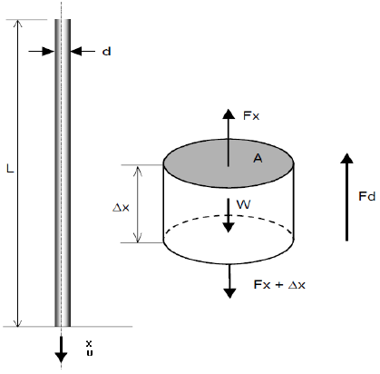 En la Fig. 3. se observa una sección de una varilla el área de una sección trasversal uniforme. A y de longitud L. Los ejes coordenados, x y u, que se encuentran direccionados hacia abajo, en donde se ven representada la distancia axial y desplazamientos de la barra (Gibbs 1963).