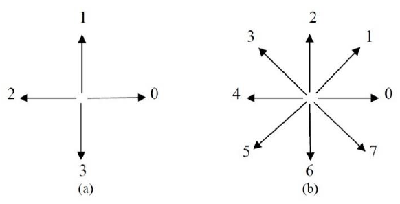 Al usar una vecindad 4N, el código de cadena es un número k entre 0 y 3, indicando un desplazamiento en la dirección kπ/2 generando cuatro orientaciones donde se utilizan los números 0, 1, 2, 3 para especificar la orientación de los segmentos, como se muestra en la Fig. 4(a).
